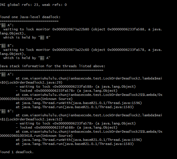 如果发生死锁,jstack 的输出结果会在末尾明确地提示 Found one deadlock,并详细列出死锁的线程、它们正在等待的锁以及它们已经持有的锁。