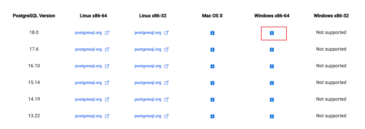 访问 PostgreSQL 官方网站:https://www.postgresql.org/download/windows