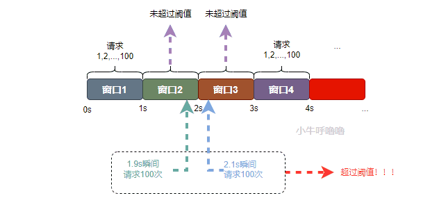 举个例子,上图我们将1s时间窗口,划分成5个200ms的小周期,记录每个周期的请求访问次数,这里沿用上一小节的情形在1.9s和2.1s的时间点,分别被人恶意并发请求了100次,当滑动到第5个小周期时,访问量为100次,未达到阈值;而当窗口滑动到第6个小周期时,访问数量变为:200,这个时候会超过阈值,触发拒绝访问的限制