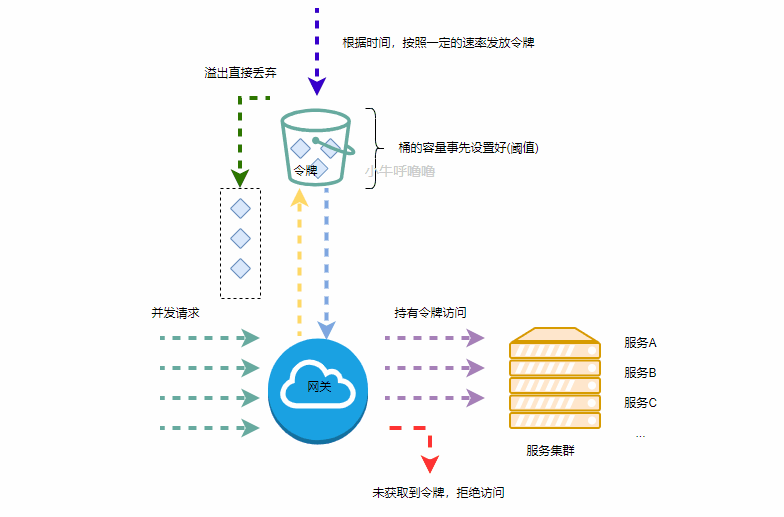 - 即使没有大流量,也求需要等待漏桶处理完成(流量限制过于严格),这样就会导致请求处理延迟,不适用于实时性要求很高的场景