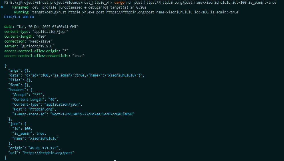 cargo run post https://httpbin.org/post name=xiaoniuhululu id:=100 is_admin:=true
